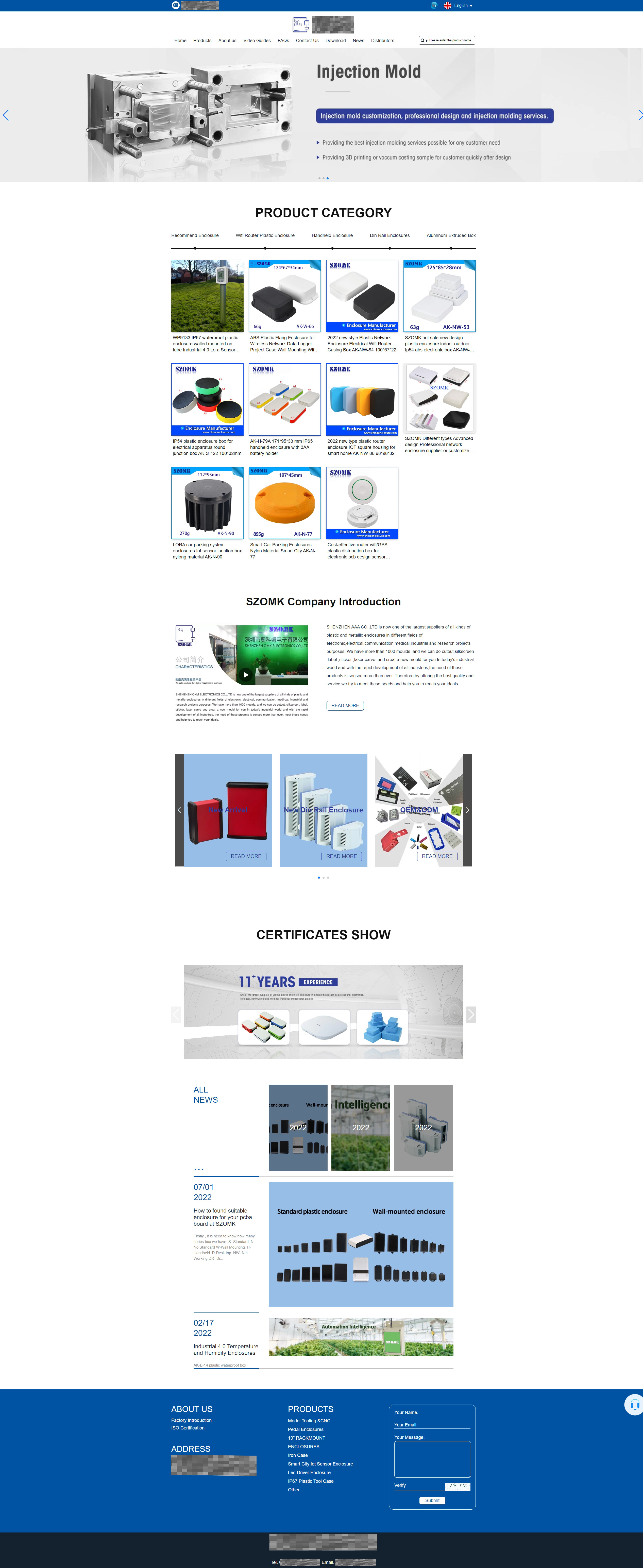 深圳市OKM电子有限公司成立于2008年,现有员工100人,厂房面积1000平方米,是中国最大的塑料密封外壳、铝制防水接线盒、塑料防水接线盒、工业机箱及仪器仪表机箱一体制造商。现有十九个系列,近千个品种,年制造塑料模具及铝压铸件500套。公司拥有最大的600吨铝压铸机、最大的6300克注塑机、最大的100吨冲压机、加工中心等,最大加工面积1000*500,各类加工设备40余台,年生产能力可达50万美元。公司拥有完善的质量保证体系,加工质量达到国际中等水平,欢迎广大客户洽谈合作或OEM。